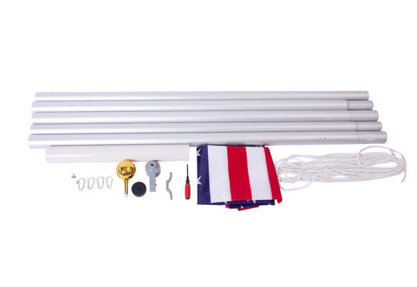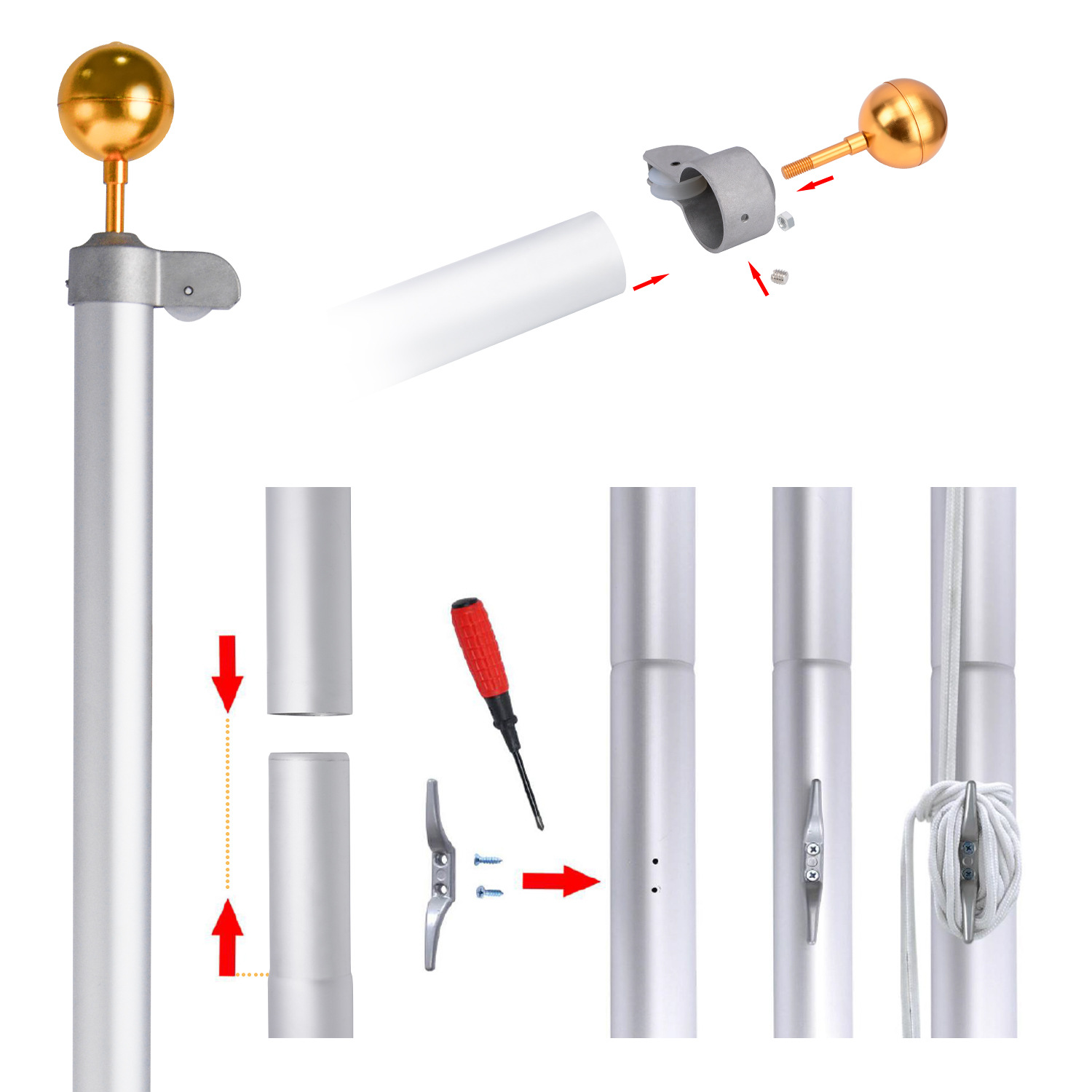 包裝內(nèi)含:五節(jié)旗,鋁本色,內(nèi)盒(鋁扣4個,繩子1根,牛角1個 滑輪1個 封蓋1個 螺絲3個 金球1個,螺絲刀1把 說明書),PVC管1根、美國旗1面(春亞紡70D 90*150),1套1箱,五層紙箱