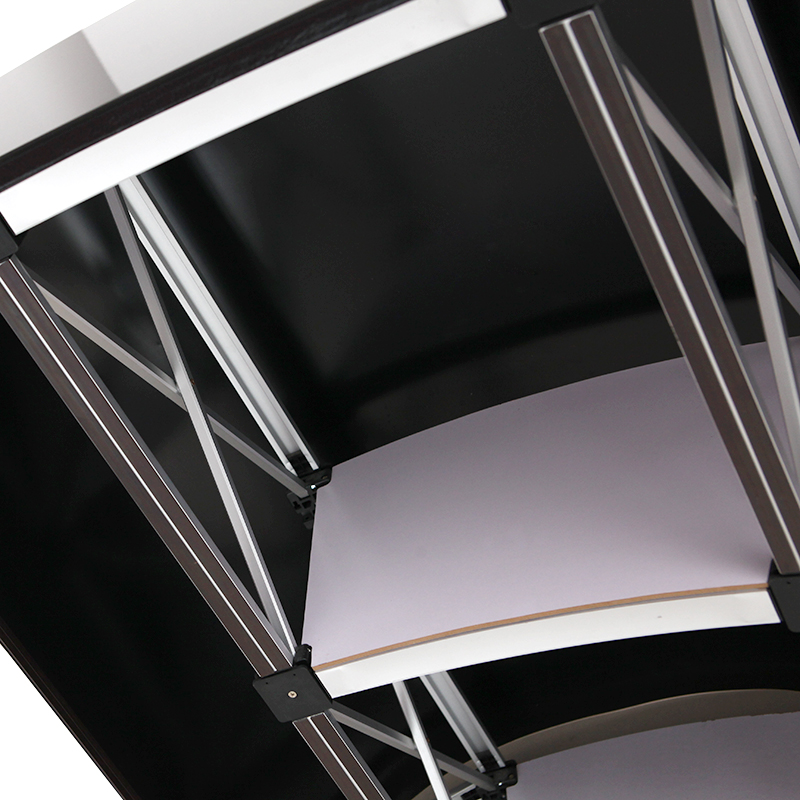 包裝內(nèi)含:鋁合金方管,尼龍塑料件,磁條帶膠,鋁磁桿28根,膠板,黑色烤漆臺(tái)面,產(chǎn)品總高度965mm,一體牛津包,說明書,1套1箱,五層紙箱。